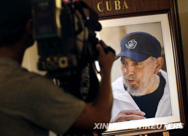 8月12日,在古巴首都哈瓦那,一名攝像師在展覽上拍攝一張古巴前領(lǐng)導(dǎo)人菲德?tīng)枴たㄋ固亓_的照片。菲德?tīng)枴たㄋ固亓_13日將迎來(lái)自己83歲生日。新華社/路透