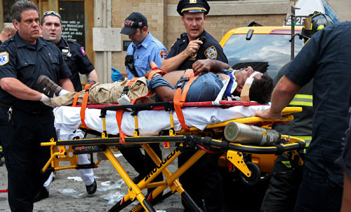 8月18日,美國紐約市內(nèi)一輛計程車撞上第72街與百老匯相鄰的地鐵站,3人受傷。圖為急救人員在現(xiàn)場進行救援。