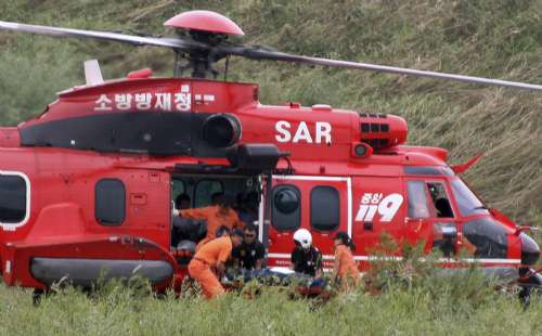 韓國救援人員七日將找到的一具尸體抬上直升機