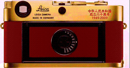 這款紀(jì)念版相機(jī),采用年份編號(hào),限量發(fā)行從1949至2009的61臺(tái)。機(jī)身鍍金,為經(jīng)典的徠卡MP外形,并配合“宮墻紅”飾皮。機(jī)頂印有紅色天安門(mén)圖案與“中華人民共和國(guó)萬(wàn)歲”字樣,機(jī)身后部印有“中華人民共和國(guó)成立六十周年,1949-2009”字樣。相機(jī)的鏡頭采用M50 mm / 1. 4ASPH鏡頭,金屬部分鍍有純金,鏡頭加刻紅色的毛體“中華人民共和國(guó)萬(wàn)歲”字樣。