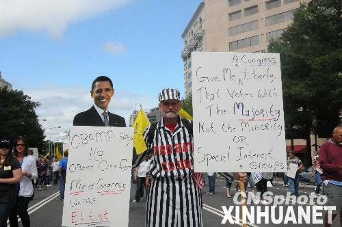 記者在現(xiàn)場(chǎng)看到,示威者舉著美國(guó)總統(tǒng)奧巴馬和美國(guó)眾議院議長(zhǎng)佩洛西的肖像以及寫(xiě)滿“不要更多的開(kāi)支,不要更多的稅收,不要更多的謊言”、“我不是你的提款機(jī)”、“支持奧巴馬的醫(yī)療改革方案等于自殺”等各種各樣的標(biāo)語(yǔ),還有人高喊“奧巴馬撒謊”、“我們受夠了”等口號(hào)。