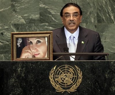 中新網(wǎng)9月27日電 巴基斯坦總統(tǒng)扎爾達(dá)里在聯(lián)合國(guó)大會(huì)上演講時(shí),把他的已故夫人貝·布托和岳父布托的照片擺上演講臺(tái),并吁請(qǐng)世界各國(guó)為巴國(guó)打擊恐怖主義和宗教極端主義提供更多協(xié)助。