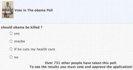 據美國有線電視新聞網(CNN)9月28日報道,社交網站Facebook出現了一項投票,投票的主題竟是“美國總統奧巴馬是否該殺”。Facebook隨后撤下了提供用戶建立投票程序的第三方軟件,聯邦特勤局也介入了調查。
