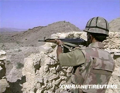 資料圖片:10月21日,巴基斯坦政府軍士兵在南瓦濟里斯坦地區(qū)與塔利班武裝交火(電視截圖)。新華社/路透