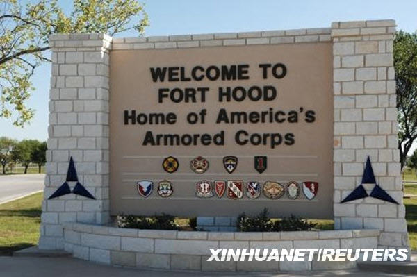 這張未標明日期的照片顯示的是美國得克薩斯州胡德堡陸軍基地大門。新華社/路透
