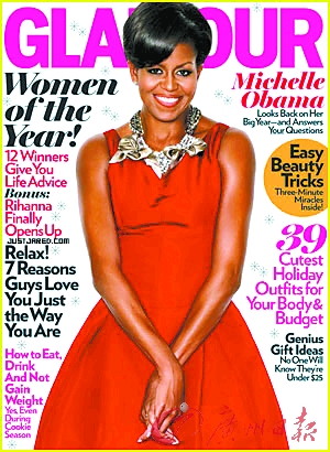 美國第一夫人米歇爾·奧巴馬以一身紅裙登上美國時尚雜志《Glamour》的封面,并且被評為“年度女性”。