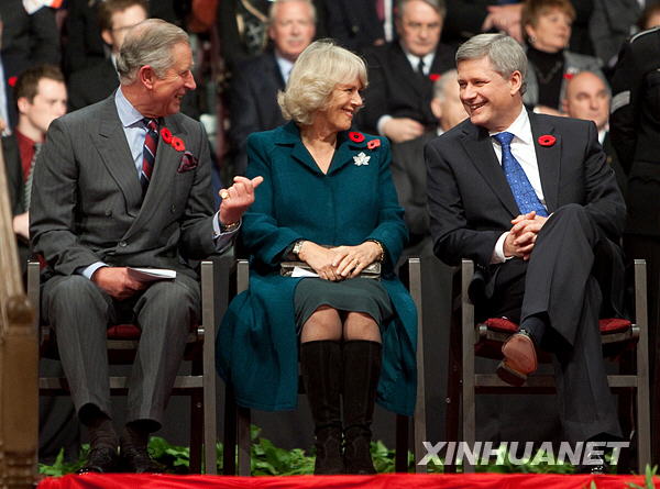 11月2日,在加拿大東部城市圣約翰,英國王儲查爾斯(左一)與妻子卡米拉同加拿大總理哈珀交談。英國王儲查爾斯夫婦2日抵達圣約翰,開始對加拿大進行為期11天的訪問。新華社發