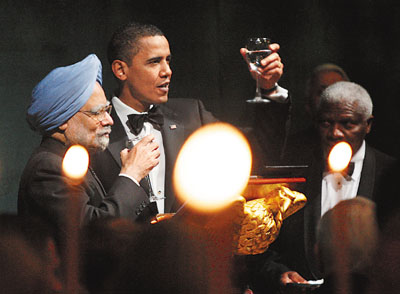 美國總統奧巴馬上任后首次設國宴款待印度總理辛格一行,國宴充滿印度風情。