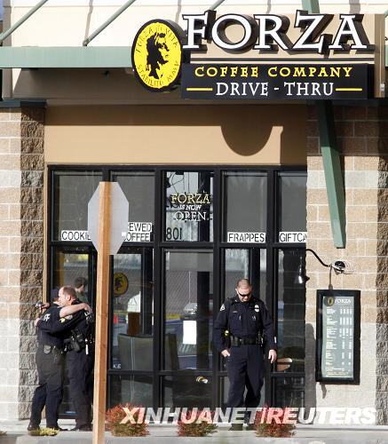 11月29日,在美國華盛頓州塔科馬的帕克蘭社區(qū),幾名警察站在一家咖啡店門口。當(dāng)日,這家咖啡店發(fā)生槍擊案,4名警察被襲身亡。 新華社/路透