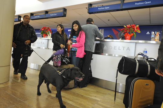 當?shù)貢r間26日,在美國底特律發(fā)生乘客炸機未遂事件后,美國機場以及航空公司加強安全警戒。圖為26日,洛杉磯機場搜爆犬在執(zhí)行任務。