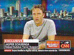 加斯帕看到奧馬爾膝上蓋的毯子正在冒煙,他立即掀開毯子對穆塔拉布搜身,此時他才注意到,穆塔拉布的褲子已經(jīng)被拉開,而他襠部附近的左腿上捆著一個貌似小型白色洗發(fā)劑瓶,并正在燃燒。加斯帕顧不得許多,一把將那團(tuán)正躥著火苗的東西扯下,并大聲呼喊其他人來救火。加斯帕稱,當(dāng)時穆塔拉布整條腿都在燃燒,褲子已經(jīng)被燒破,如同一個“火人”!