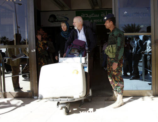 1月5日,一名外國人走出警察把守的也門薩那國際機場。新華社/路透