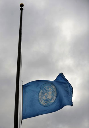 1月13日,美國紐約聯(lián)合國總部大樓前的聯(lián)合國會旗降半旗向海地地震中遇難者致哀。根據(jù)中國地震臺網(wǎng)測定,海地當?shù)貢r間12日下午發(fā)生里氏7.3級強烈地震,造成首都太子港大量房屋受損或倒塌。當?shù)厝耸空J為,地震可能造成大量人員傷亡。新華社記者申宏攝