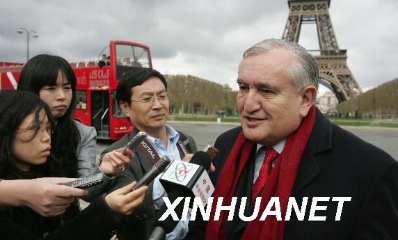 資料圖片:2008年4月6日,拉法蘭在巴黎埃菲爾鐵塔前接受部分中國駐法媒體記者聯合采訪。