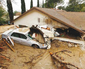 美國洛杉磯暴雨引發泥石流,大量泥巴與石塊7日沖進高級住宅區,圖中的拉坎納達嶺小區災情最為嚴重。此地去年夏天發生森林大火,樹木與植被遭到摧毀。