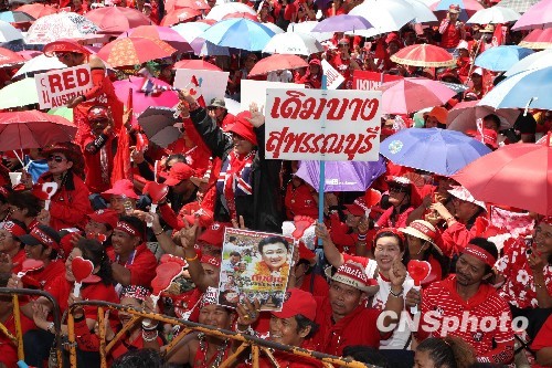 自12日開始的泰國紅衫軍示威活動,14日進入火熱境地,從五世王廣場經御行大道至民主紀念碑,延綿近6、7公里長的大路擠滿了紅衫軍示威者。紅衫軍領導人威臘14日中午在紅衫軍聚集中心發表聲明說,阿披實政府必須在24小時內解散眾議院,否則將面臨更大規模的示威游行。 中新社發 顧時宏 攝