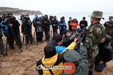 1日上午,韓國海軍陸戰隊大隊長在仁川甕津郡白翎島長村浦口海岸邊向記者介紹搜救工作的進展狀況。