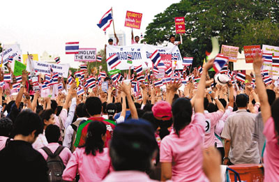 據香港《文匯報》報道,泰國反獨裁民主聯盟(“紅衫軍”)曼谷的示威活動持續近3星期,今天(3日)將再次舉行大規模反政府活動,要求總理阿披實解散國會下院。約3000名反對紅衫軍的群眾昨日(2日)身穿粉紅色衫,在曼谷倫披尼公園集會,反對“紅衫軍”的解散國會及修改憲法等要求。