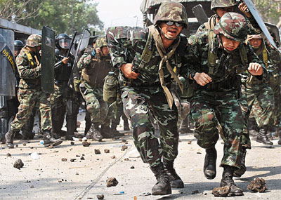 泰國(guó)士兵被紅衫軍猛烈圍擲石頭。