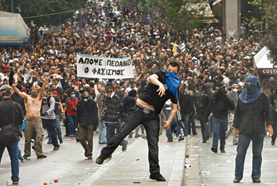 希臘5日爆發(fā)全國(guó)性罷工及10萬(wàn)人大示威,抗議政府的財(cái)政緊縮政策。據(jù)香港《文匯報(bào)》報(bào)道,在首都雅典約60人試圖沖破警方的封鎖線沖擊國(guó)會(huì),警方揮動(dòng)警棍還擊,又施放催淚氣體。有銀行遭投擲燃燒彈放火焚燒,最少3名職員死亡,5人受傷送院,消防員疏散約20人。警方總動(dòng)員應(yīng)付局面,并宣布首都進(jìn)入戒備狀態(tài)。