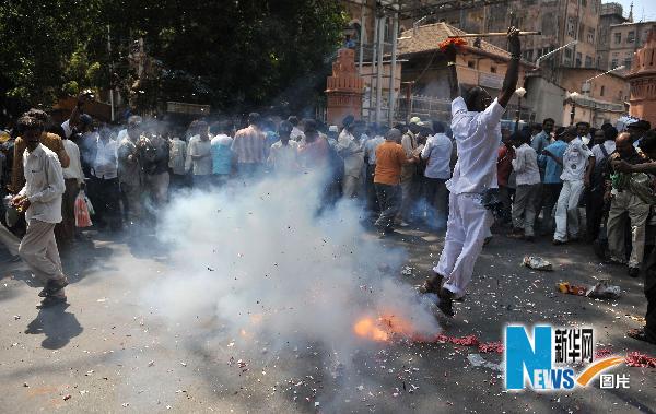 5月6日,人們在曾經發生恐怖襲擊的印度孟買CST火車站外燃放鞭炮,慶祝襲擊案罪犯卡薩布被判死刑。新華社/法新