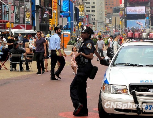 5月2日,紐約時報廣場依舊人流如織,絲毫不受1日晚間那一沒被引爆的汽車炸彈事件影響。但2日時報廣場警力增多,圖為女警在廣場巡視。1日晚間,一輛停于時報廣場的日產車冒煙并發出輕微爆破聲,附近的小販報警后,紐約警察從車內清理出大量爆炸物,幸而沒引發更大的災難,紐約市長彭博稱“躲過一劫”。 中新社發 孫宇挺 攝