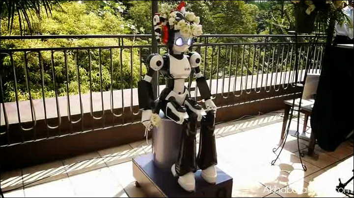 16日在東京日比谷公園,一對日本新人在機器人牧師i-Fairy的見證下舉行結婚典禮,i-Fairy原本在博物館和會展中心引導游客,這次的新任務對它來說是個新挑戰。工程師表示,他給i-Fairy戴上花環并輸入牧師程序,讓它可以完成對這對新人的證婚儀式,據悉完成這一活動只需要100V直流電流來讓i-Fairy保持直立和做動作。