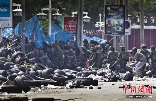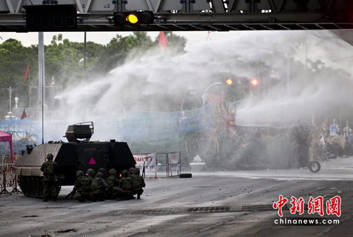 據報道,泰國軍方的裝甲車突破了一處紅衫軍示威地點的路障,進入示威者大本營,軍方向示威者發射催淚瓦斯及開槍,還出動至少2架直升機協助驅散行動。另外,軍隊設立檢查站封鎖了一些路段,禁止車輛通行。