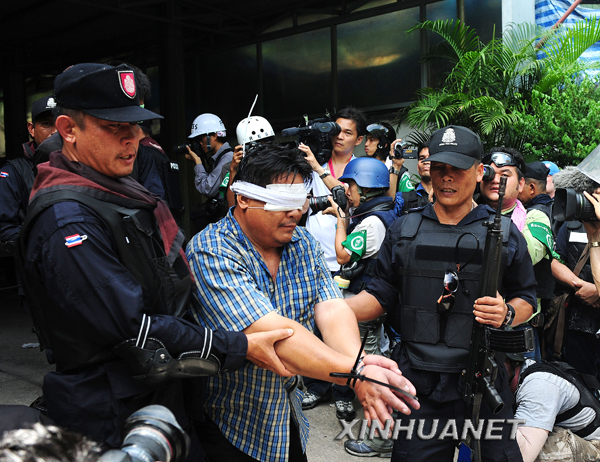 5月19日,在泰國(guó)首都曼谷,警察將在軍隊(duì)清場(chǎng)行動(dòng)中逮捕的一名“紅衫軍”成員帶走。當(dāng)天凌晨,泰國(guó)軍隊(duì)對(duì)位于曼谷市中心商業(yè)區(qū)的“紅衫軍”示威者發(fā)起清場(chǎng)行動(dòng),“紅衫軍”領(lǐng)導(dǎo)人宣布停止在曼谷為期兩個(gè)多月的集會(huì)并向警方自首。泰國(guó)政府緊急狀態(tài)公共管理中心發(fā)言人當(dāng)天發(fā)表電視講話說(shuō),目前曼谷的局勢(shì)已經(jīng)在軍方控制下。新華社記者陳鐸攝