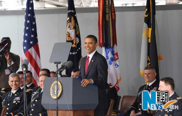 5月22日,在美國紐約州北部哈德遜河西岸西點鎮的西點軍校,美國總統奧巴馬(中)出席2010年度畢業典禮。當日,西點軍校舉行2010年度畢業典禮,1002名學員獲得理學學士學位,并被授予陸軍少尉軍銜。 新華社記者谷欣容攝