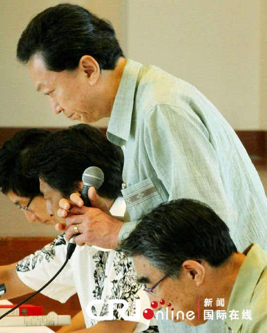 當地時間2010年5月23日,日本沖繩,鳩山在會議上鞠躬道歉。