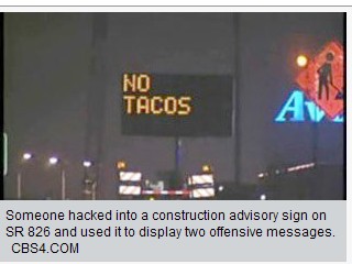 邁阿密一條公路的電子廣告牌遭黑客入侵,出現“不要玉米餅”(NO TACOS)的字樣。