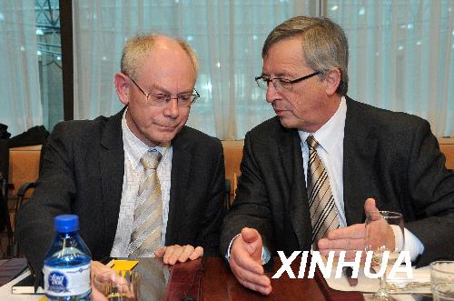 2010年3月15日,在比利時首都布魯塞爾的歐盟總部,歐元集團主席、盧森堡首相容克(右)與歐洲理事會常任主席范龍佩在歐元區(qū)財長會議上交談。當(dāng)天,歐元區(qū)16國財政部長在布魯塞爾舉行會議,希臘債務(wù)危機成為會議的主要議題。新華社記者武巍攝