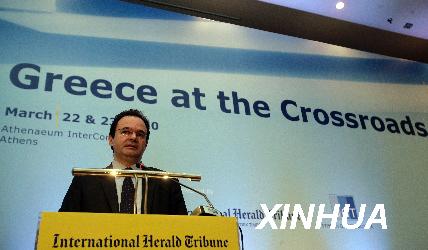 2010年3月23日,希臘財政部長喬治·帕帕康斯坦季努在雅典舉行的“希臘在十字路口上”經(jīng)濟研討會上發(fā)言。新華社發(fā) 馬里奧斯·羅洛斯攝 資料圖片