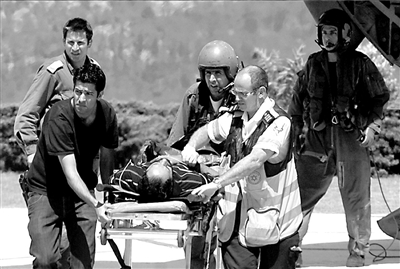 一名傷員被送往耶路撒冷的醫院救治。新華社/法新