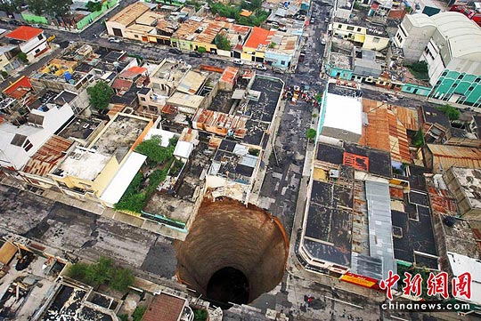 此外,受連場暴雨影響,危地馬拉城一處出現(xiàn)地面下陷,形成一個深60米、直徑30米的地洞。據(jù)報(bào)道,這個巨大地洞吞噬了一幢3層高大廈,1人死亡。