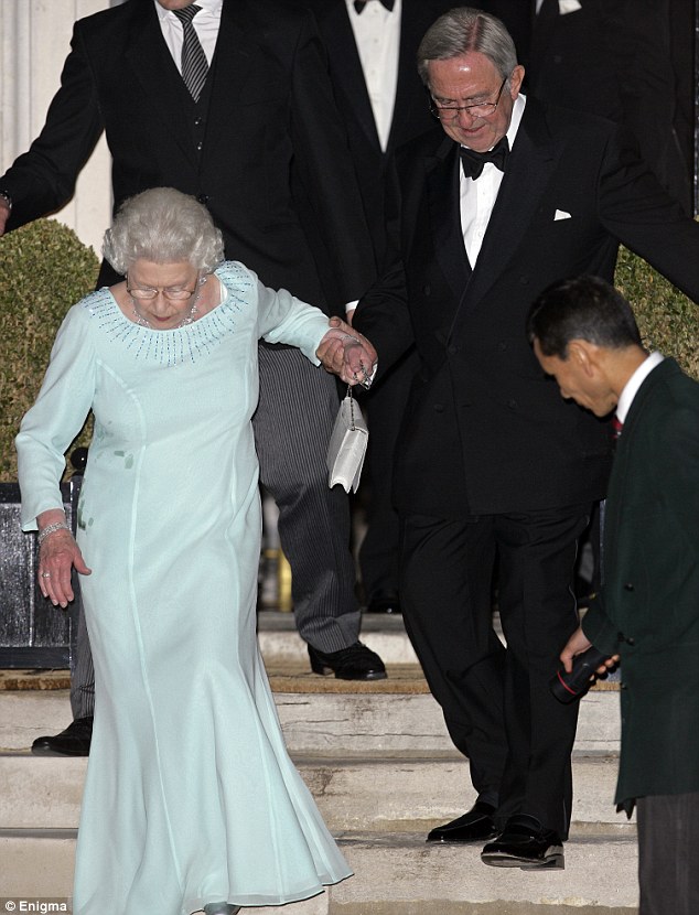 聚會結束后,在康斯坦丁國王的幫助下,已經84歲的女王走下樓梯離開。