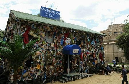 這家酒店名為“保護(hù)海灘”,位于臺伯河畔圣安琪兒古堡旁,出自德國藝術(shù)家哈·舒爾特之手。它共有5個房間,用去12噸垃圾,其中包括塑料袋、漁網(wǎng)、舊衣服、玩具、易拉罐等,甚至包括一只搖擺木馬和人體模型的一條腿。