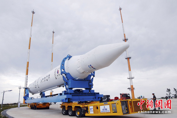韓國首枚運載火箭“羅老”號6月9日將再次發射升空。羅老號曾于去年8月25日第一次發射升空,但由于衛星保護整流罩未能分離,最終未能進入正常軌道。圖為6月7日,韓國“羅老”號運載火箭運往全羅南道羅老航天中心。