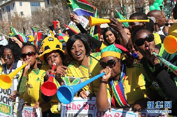 6月9日,熱情的球迷。當日,數萬民眾在南非約翰內斯堡為南非國家足球隊征戰2010年世界杯舉行聲勢浩大的聲援活動。民眾期望南非國家足球隊能在世界杯比賽中取得優異的成績。新華社發(梁銓攝)