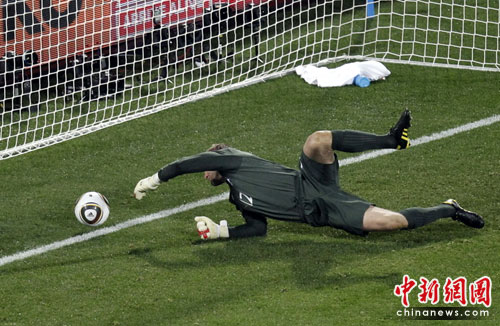 比賽進(jìn)行到上半場第42分鐘,美國隊策動了一次威脅不大的攻勢,當(dāng)時鄧普西帶球到前場左右晃動之后一記遠(yuǎn)射,皮球綿軟無力的滾向球門。然而此刻,驚人的一幕發(fā)生了:擺好架勢準(zhǔn)備接球的英格蘭隊門將格林在拿球的時候,竟然出現(xiàn)了脫手。