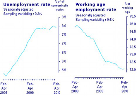 圖為英國國家統(tǒng)計局公布的圖表,圖左為2008年以來的失業(yè)率曲線圖;圖右為勞動人口就業(yè)率變化曲線圖。