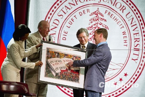 當(dāng)?shù)貢r(shí)間6月23日下午,俄羅斯總統(tǒng)梅德韋杰夫在斯坦福大學(xué)演講,希望以美國(guó)硅谷為模版,在莫斯科郊外打造“俄國(guó)硅谷”。他還呼吁美國(guó)高科技人才和投資者到俄國(guó)共創(chuàng)輝煌。圖為梅德韋杰夫在回答聽眾提問。 中新社發(fā) 陳鋼 攝
