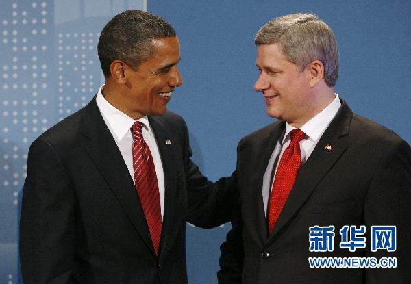 6月26日,在加拿大多倫多皇家約克飯店,加拿大總理哈珀(右)歡迎前來出席二十國集團峰會的美國總統奧巴馬。新華社發