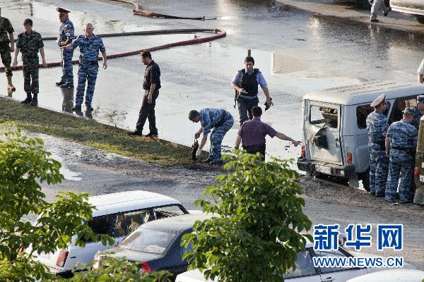 6月30日,調查人員在俄羅斯車臣共和國首府格羅茲尼市中心查看爆炸現場。格羅茲尼市中心當天下午發生一起自殺式爆炸襲擊,造成至少1人死亡,10人受傷。新華社/路透
