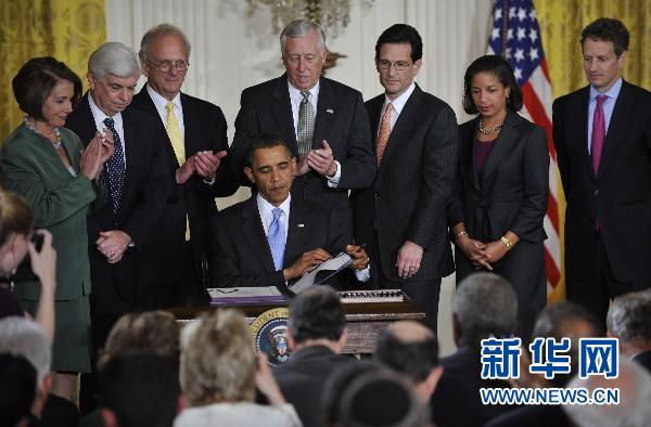 7月1日,在美國首都華盛頓白宮東廳,美國總統奧巴馬(中)簽署對伊朗制裁法案。這項對伊朗實施單方面制裁的法案6月24日由國會參議院和眾議院表決通過,需獲總統簽字生效。 新華社記者 張軍 攝