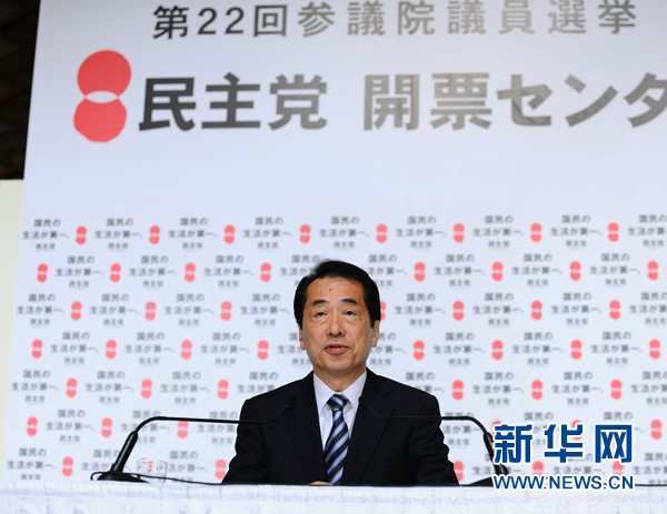 7月11日,在日本首都東京民主黨競選總部,民主黨代表(黨首)、日本首相菅直人出席記者會。據日本廣播協會電視臺報道,日本執政的民主黨在11日舉行的國會參議院選舉中失利,自民黨等在野黨占據了參議院超過半數的議席。 新華社記者 季春鵬 攝