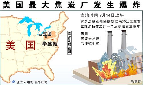 賓夕法尼亞州阿勒格尼縣政府發言人凱文·埃文托說,美國鋼鐵公司下屬克萊爾頓焦炭廠一個焦爐組14日9時30分(北京時間21時30分)左右起火爆炸,致使多名工人燒傷。