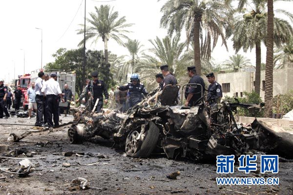 6月20日,在伊拉克首都巴格達,警察在爆炸現場查看。伊拉克官員20日說,首都巴格達當天發生兩起汽車炸彈爆炸襲擊。新華社/法新