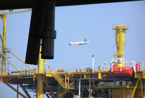 資料圖:日本海上自衛隊的P-3C反潛機在中國鉆井平臺上空低空盤旋。近年來,中日兩國軍艦軍機和公務船只一直保持對東海油氣田區域的監視。